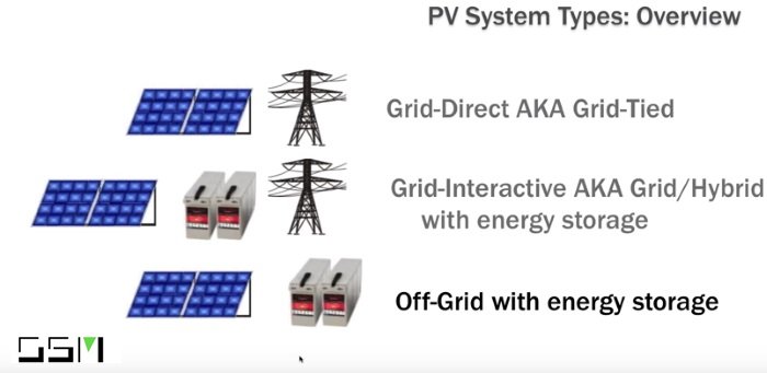 There are three main types of solar PV and storage systems: grid-tied, grid/hybrid and off-grid. They all have their advantages and disadvantages and it really comes down to the customer’s current energy supply and what they want to get out of the system.